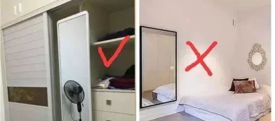 卧室墙上最好不要挂镜子,不然半夜醒来迷迷糊糊的,看到镜中披头散发的自己很容易被吓到,久而久之容易影响身体健康,可以考虑在衣柜内部装个推拉镜比较好。