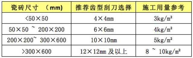不同规格瓷砖需使用不同尺寸的齿形刮刀。