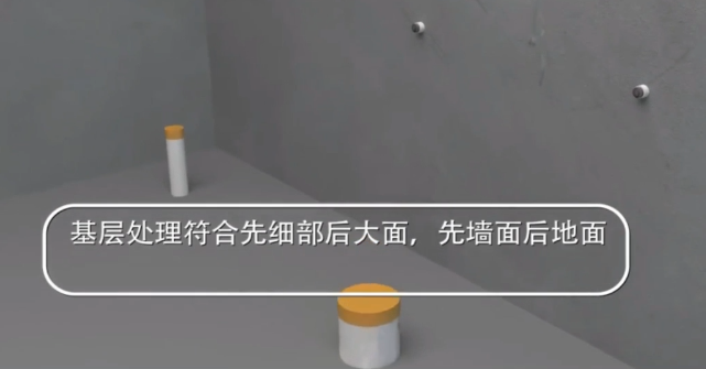 所有细部处理结束后,进入基层处理阶段,用铲刀将粘在找平层上的灰渣除掉,表面必须平整,凹陷处用堵漏王进行抹平。然后用扫帚全面清扫墙面、地面、细部等各个部位。