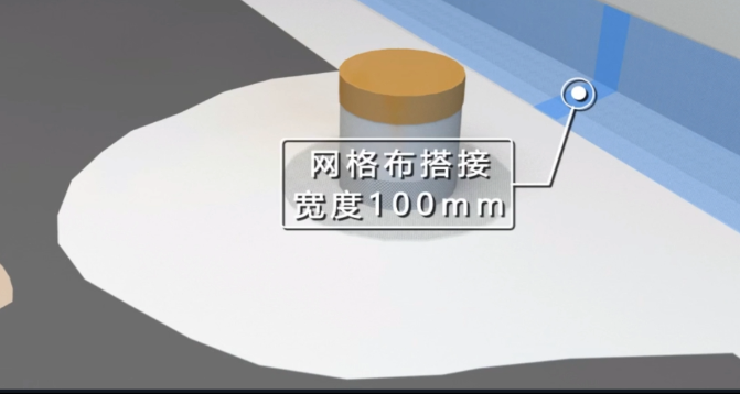 并立即铺设网格布进行增强处理,用漆刷将网格布按压平整与下层涂料贴合紧密,搭接宽度为100mm;