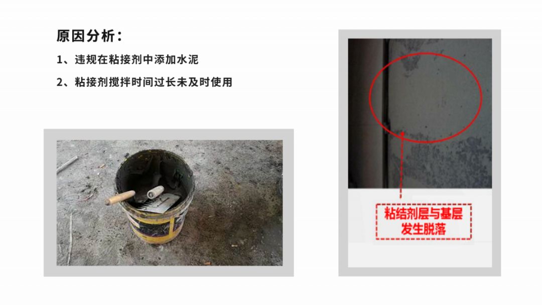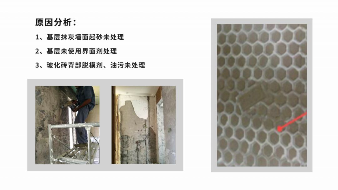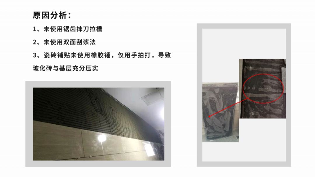在玻化砖的应用场所由铺地变成上墙后,相对应的施工工艺也应做调整,如仍采用传统的水泥砂浆湿贴瓷质砖上墙,是一种不成熟的施工工艺,极易造成空鼓脱落等质量问题,尤其是公共部位人流量比较大,容易坠落伤人,严重危害了人们生命财产安全。